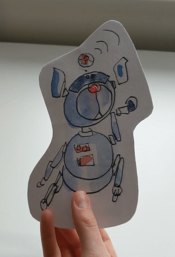 Now flip Sparky over. Fold the rectangular switch along the dotted line, then glue it onto the rectangle at the bottom of the cut-out.