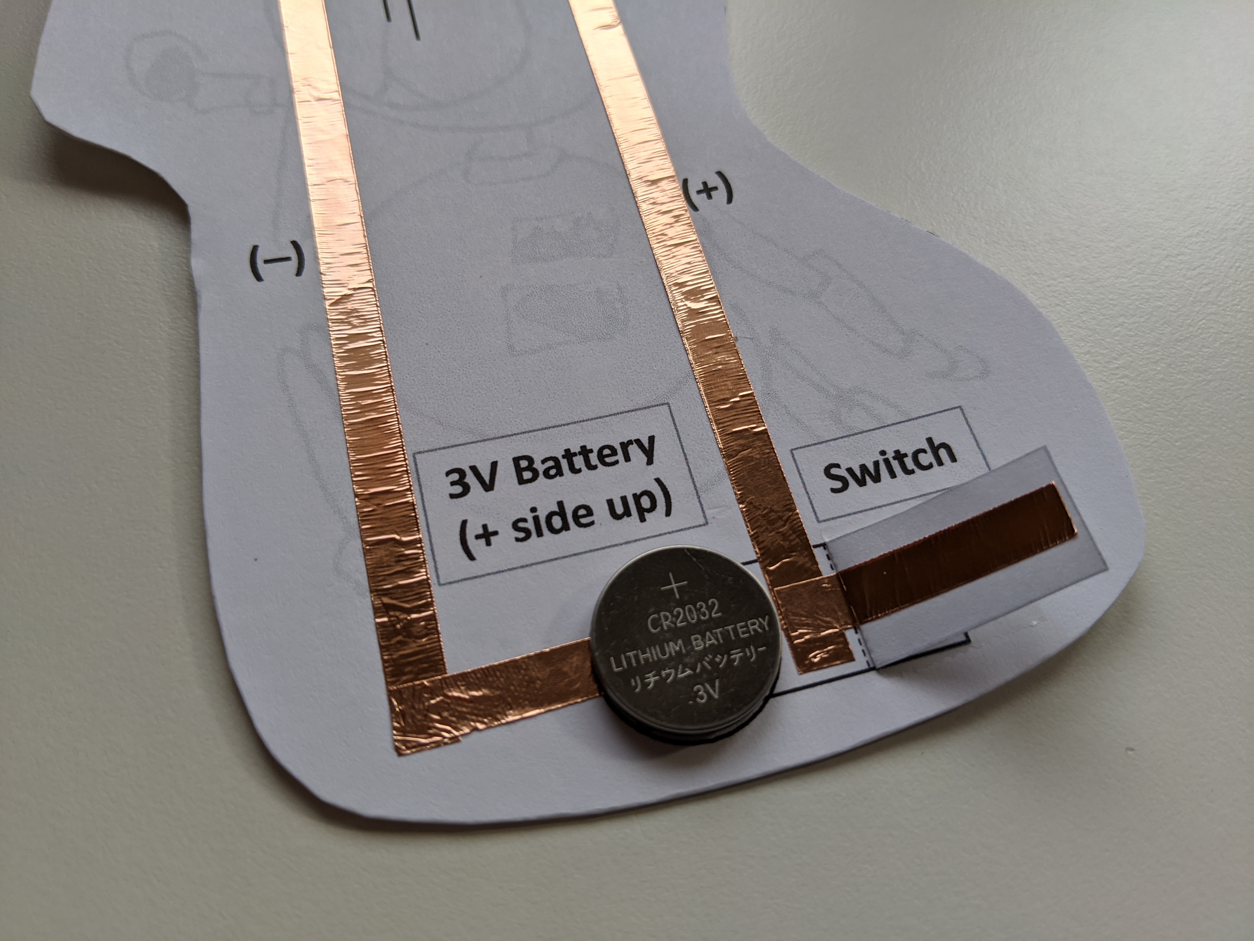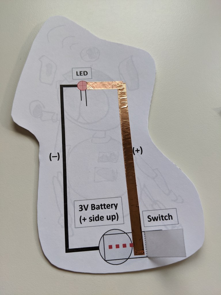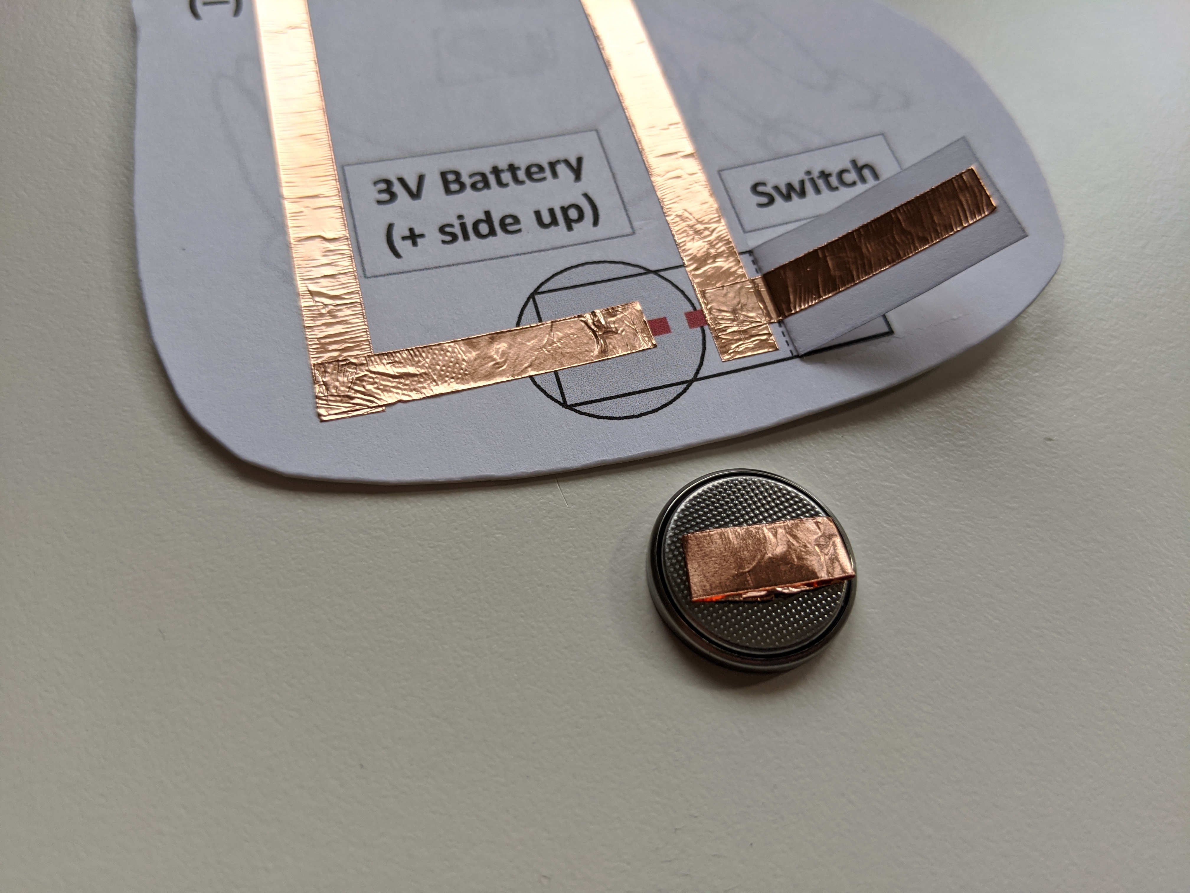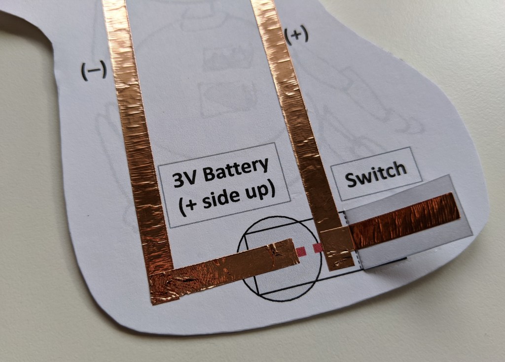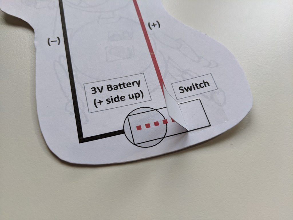 Then tape along the switch flap. This competes the positive side of your circuit (where the electricity is flowing from the battery towards the LED).