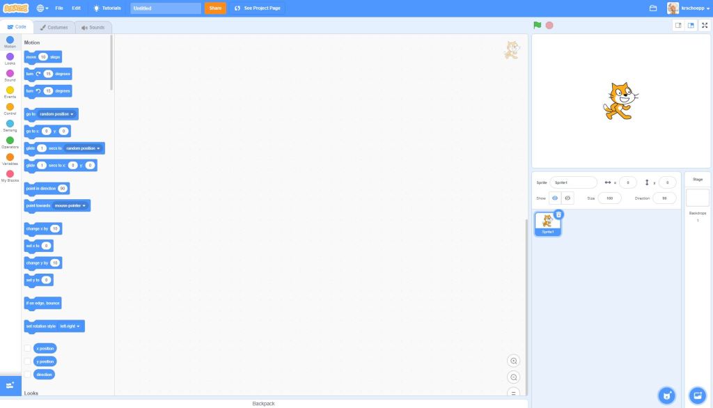 So what is happening inside Scratch? Let’s take a look. This is what a brand new project looks like: