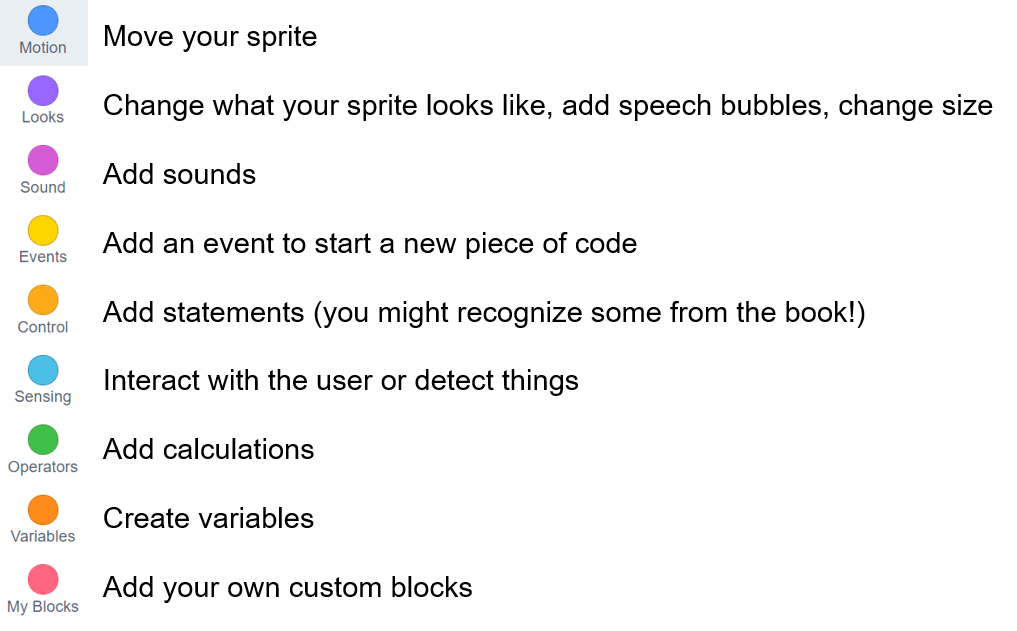 Once you have your characters, you can start building your program! Here are the different types of blocks: