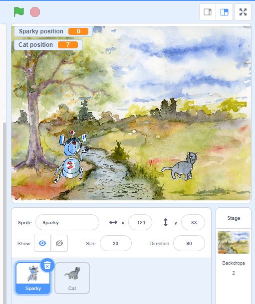 That is all it takes to create a program! Of course, you may want to add more. You can take a look at the code for my program here by clicking “See Inside” at the top right corner. In my program, you can see how Sparky and the cat interact together, and how to use an if/else statement (which you may recall from our book!).