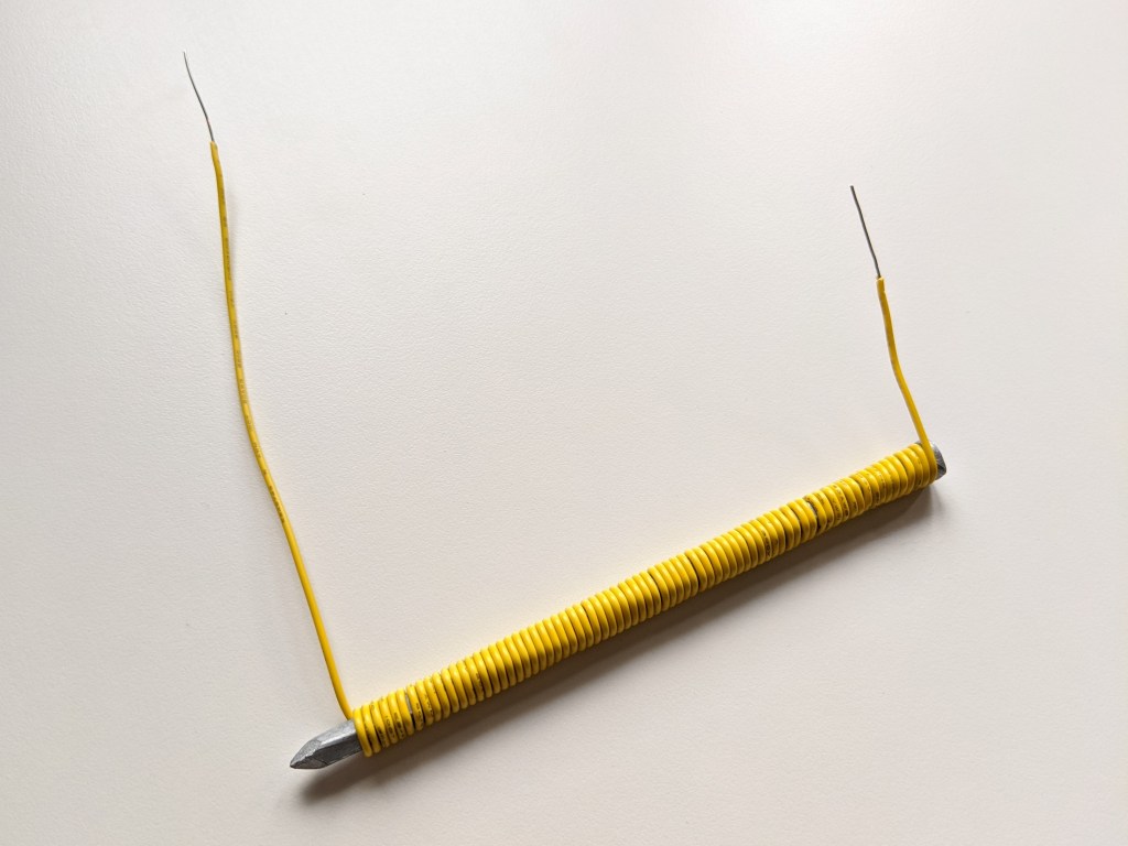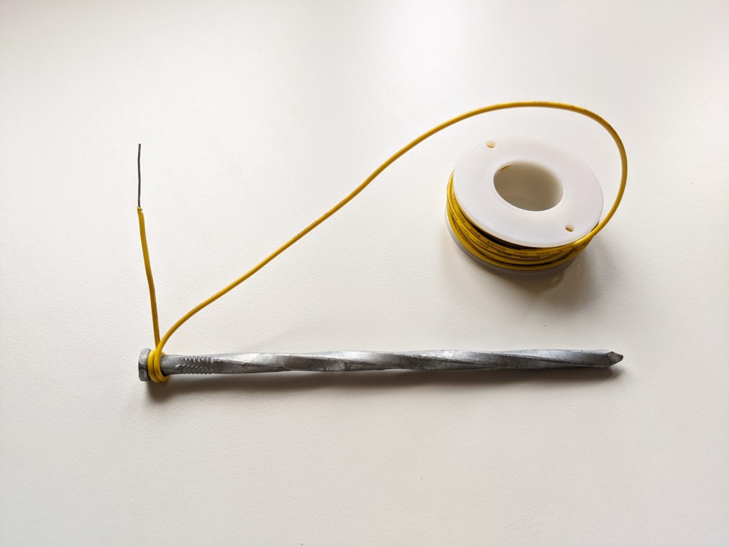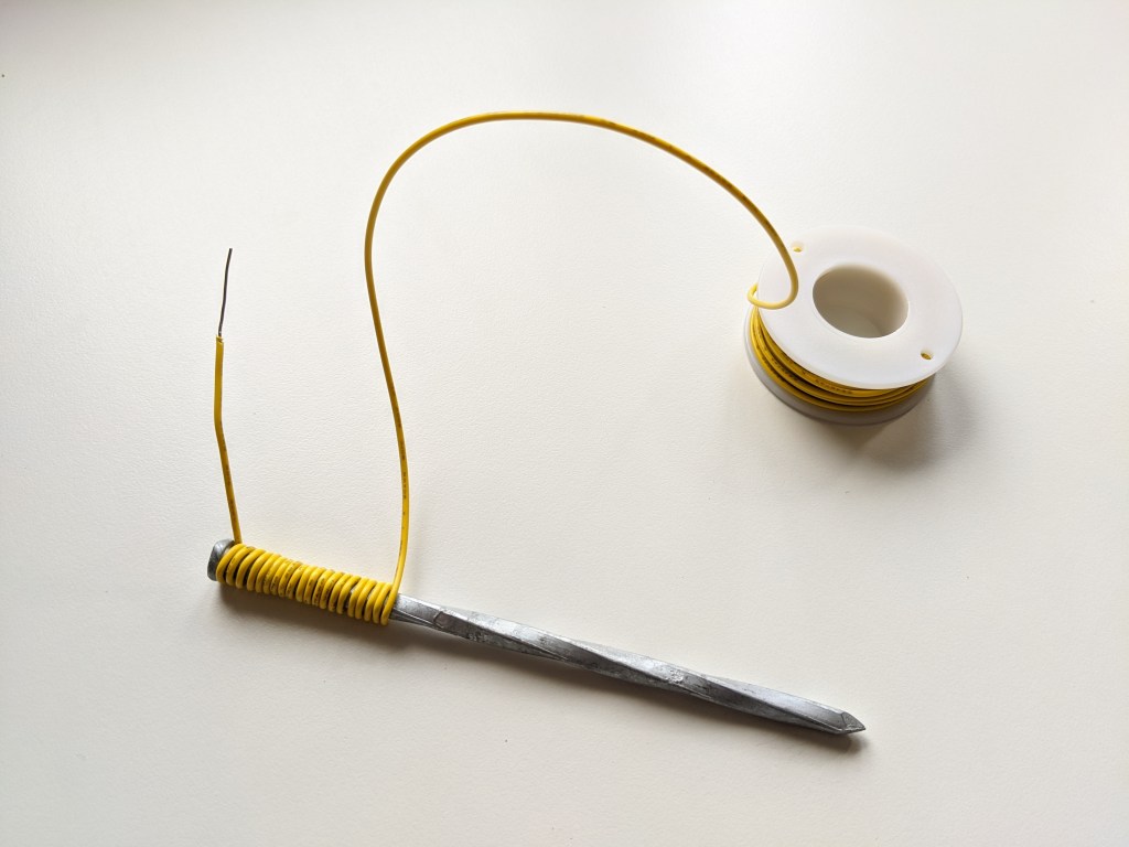So what is happening here? When electricity moves through a wire it creates a small magnetic field. When you coil the wire up around the nail you are combining a bunch of small magnetic fields to create a larger magnetic field through the iron nail.