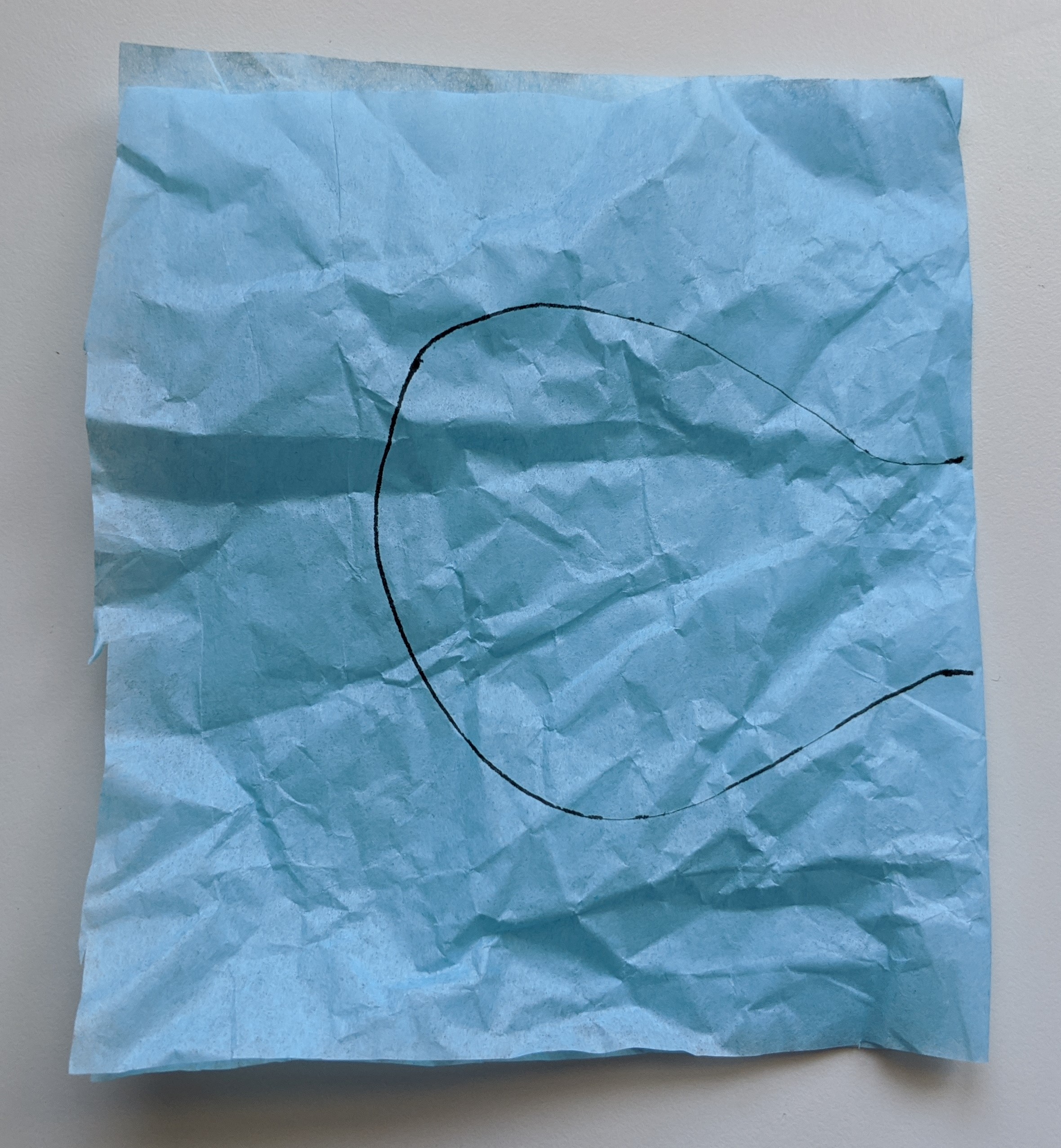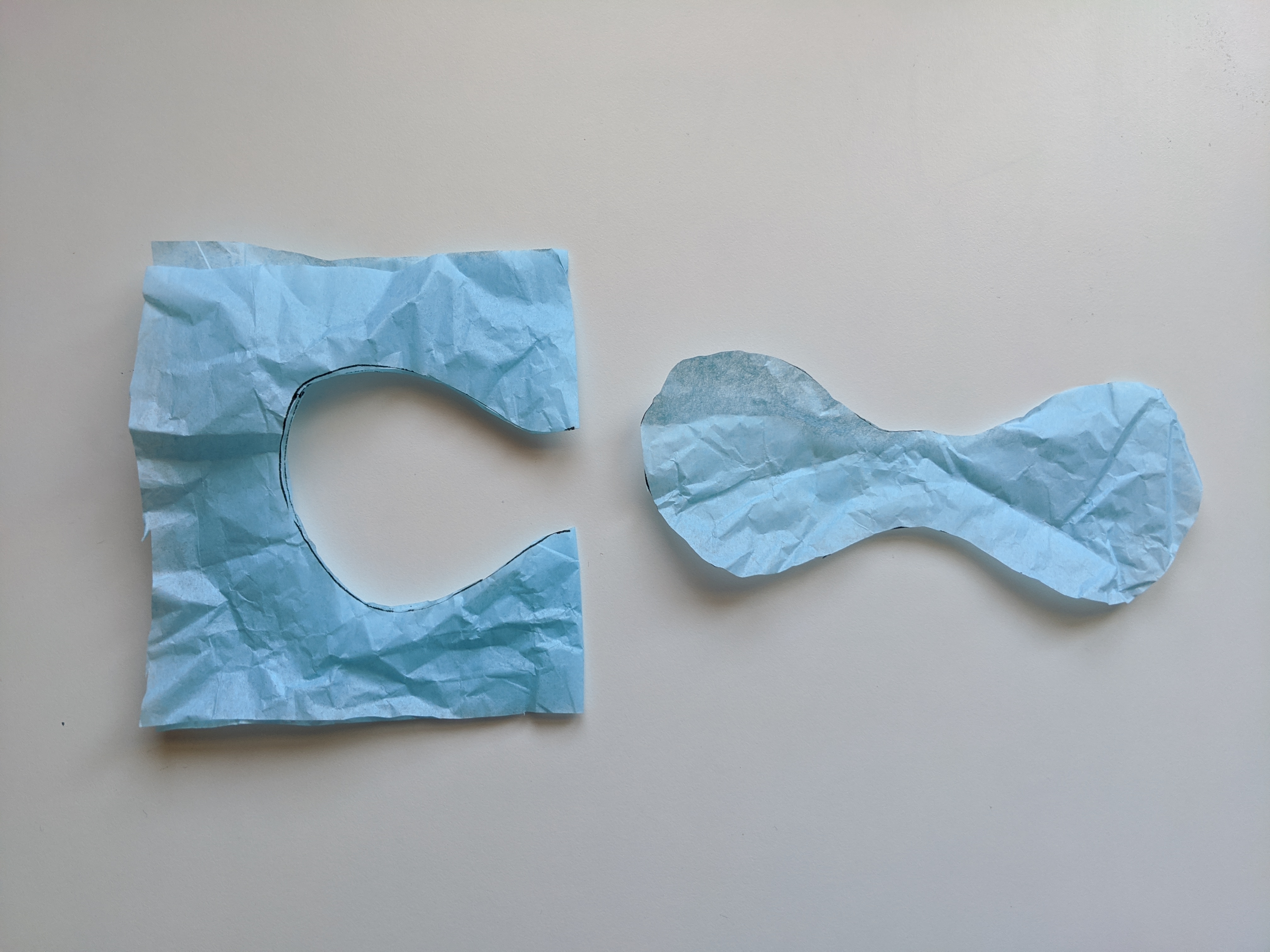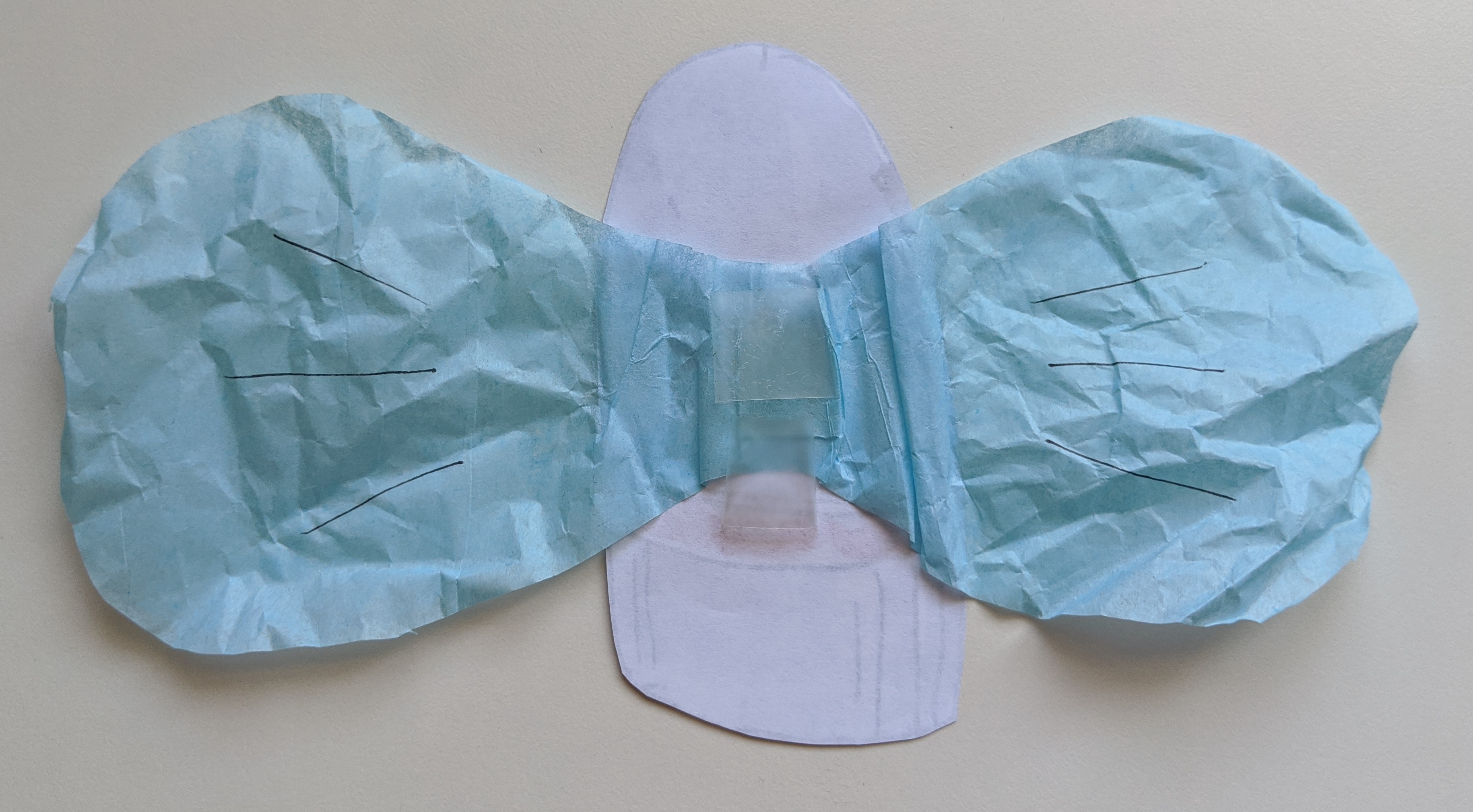 Next, make the butterfly’s wings. Fold the tissue paper in half, then draw one wing along the folded edge. Cut it out and unfold it into two wings! If you’d like you can decorate the wings with markers.