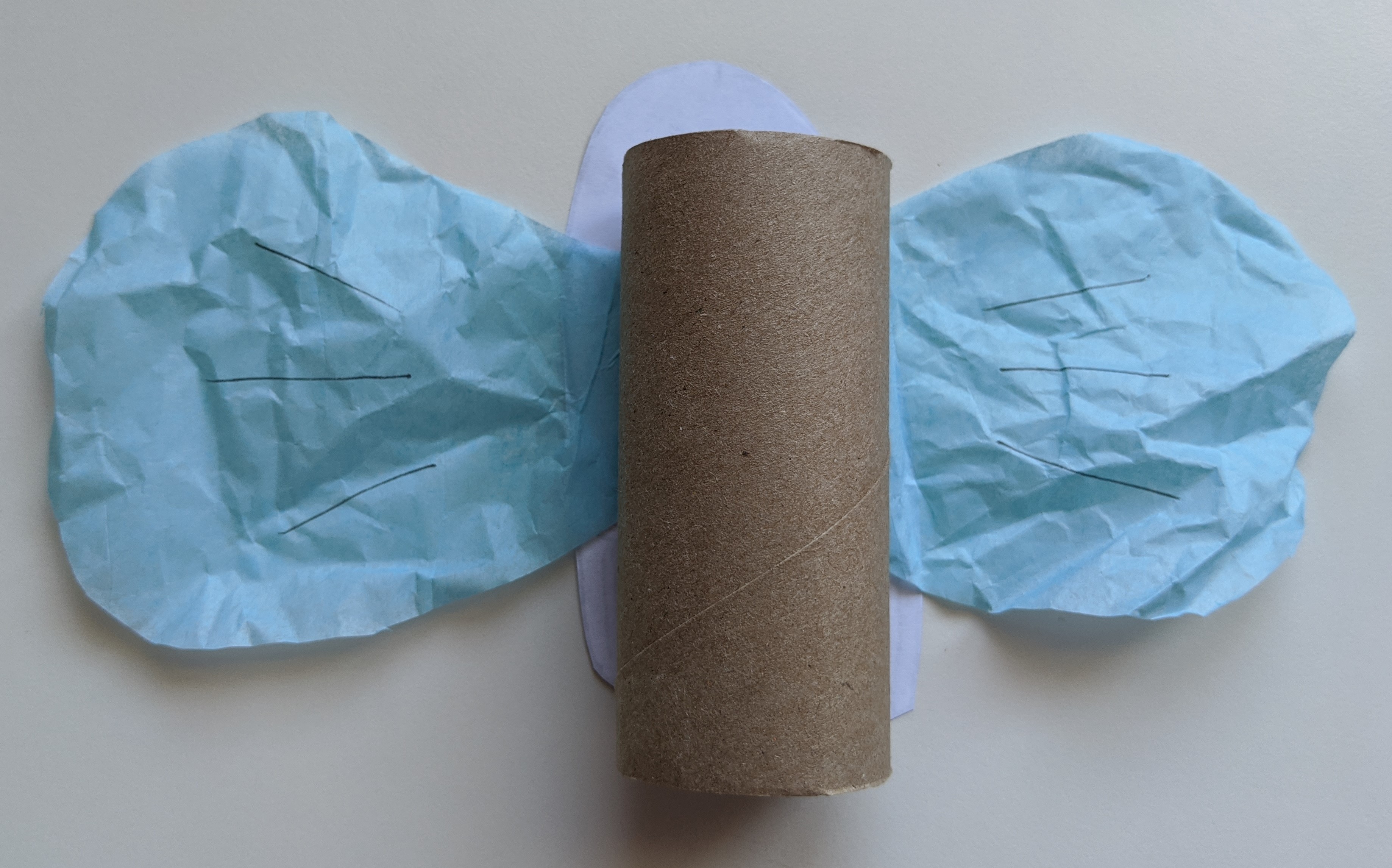Next, tape or glue the wings onto the back of the butterfly’s body. Then tape this onto the toilet paper roll.