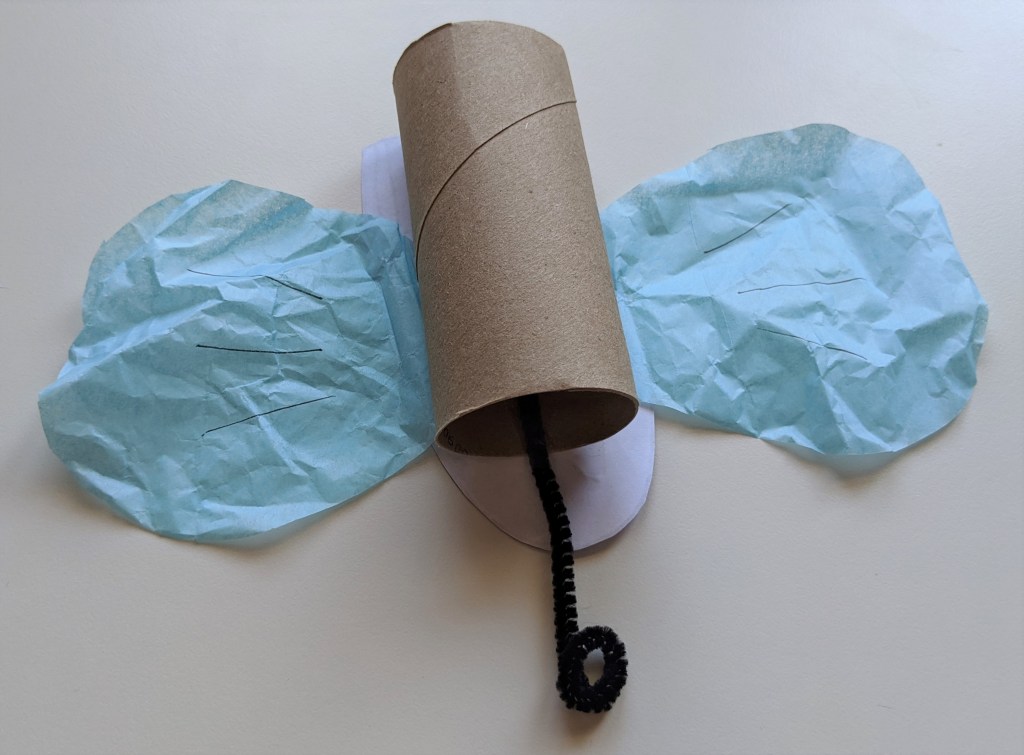 Optional: tape a pipe cleaner inside the toilet paper roll to be the butterfly’s antenna.