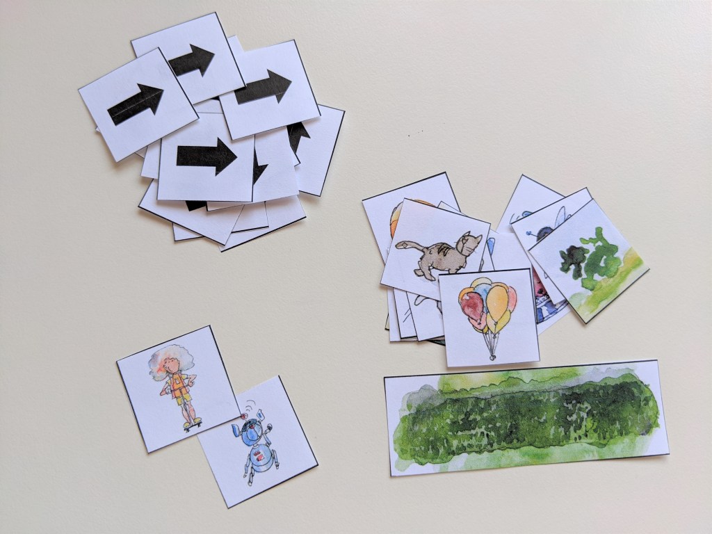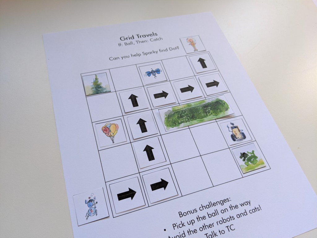 Next, place Sparky and Dot somewhere along the edge of the main grid. Then place some of the obstacles within the grid. It doesn’t matter where you place the obstacles, as long as there is at least one path between Sparky and Dot. Think about the story you want to tell; in my grid, Sparky has to make it all the way to Dot without running into the hedge, trees, or other robots. He also needs to focus and not let the balloons distract him from his mission!
